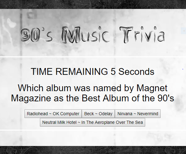 A timed trivia game, featuring excellent music and, uh, extra snark.